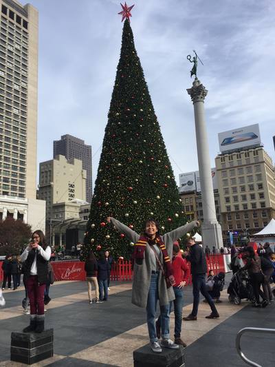 Terri Lyders and her husband Mark Reynolds, and I got to spend my first American Christmas with them. I remember waking up in the morning asking them “I’ve got presents?!” just like Harry Potter. I’ve never received so many presents in my life. On the same day, they took me sightseeing around the city. We visited the life-sized Gingerbread House at the Fairmont Hotel and the huge Christmas tree in Union Square. In the evening, we came back home to have a traditional Christmas dinner. The feast was just like something I’ve seen in movies when I was young. There was a big turkey, cranberries, stuffing and lots of cookies and chocolate for dessert. It was a really wonderful Christmas dinner.